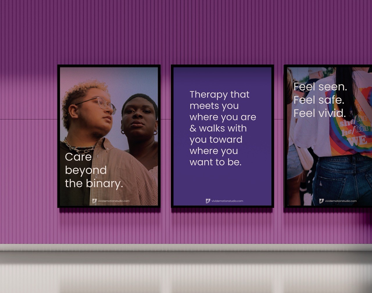 We started with a mark that feels both grounded and expressive. An expressive and bold “V,” set in a gradient of rich purples and pinks that echo emotion, energy, and transformation. From there, I explored branding concepts for their website, business cards, and posters.